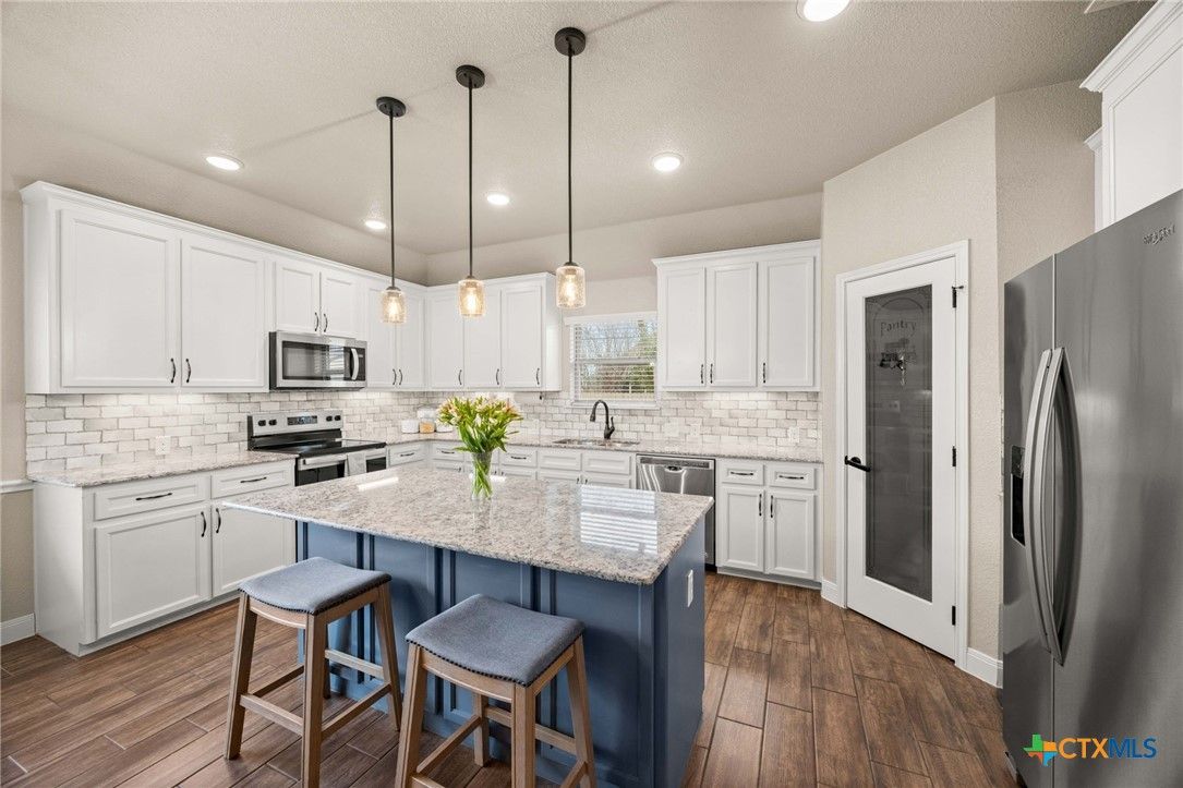 This kitchen is bright and functional with white cabinetry, yards of granite countertops, a stylish tile backsplash, a corner walk-in pantry, and a brand-new stove. The two-tone look — white uppers and a blue island — gives personality without being trendy for the sake of it. Functionally, the space supports both everyday cooking and entertaining with ease.